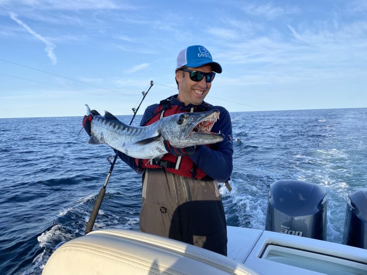 Upon studying their catch further, Rogers noticed the lack of vertical stripes and particularly large teeth on this fish. That’s when they realized they had caught a large barracuda.