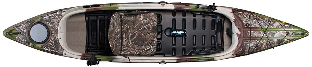 Jackson’s popular sit-inside fishing kayak is now offered in a waterfowl camo design, making it a dual-purpose craft for the outdoorsman who likes to cast and blast. Includes the gear mounts, staging systems, and seating you’d expect in a Jackson Kayak, along with features specific to waterfowling, like a fitted blind and decoy bag.