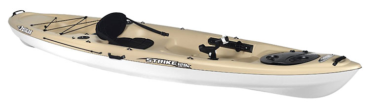 Clean lines and a sleek design define the agile and sporty Strike series of kayaks. Maneuverable and stable, the Strike 120X offers plenty of speed, capacity, and storage space. The angler version is loaded with fishing features including flush-mount rod holders and flat mounting surfaces.