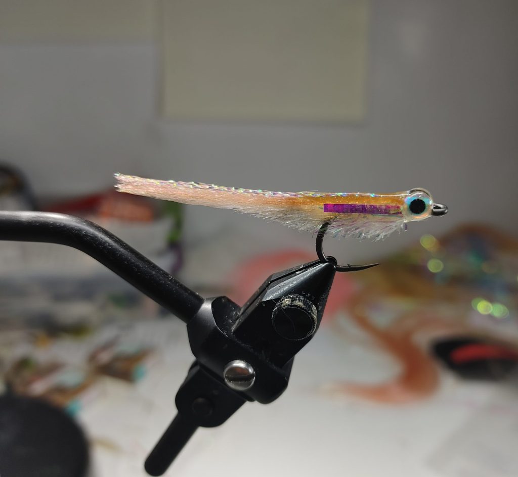 There is a way to consistently create instability in the fly’s balance that fights against the keel action of the hook bend and causes a fly to naturally roll on its side without spinning or twisting. By creating a fly structure with UV cure epoxy on the back only, you can slightly overwhelm the keel action from the hook bend so that the fly rolls side to side on the strip, and flutters on its flank when paused. This concept is incorporated into a fly pattern below. Fulling Mill will be picking up this pattern, deemed “Goodspeed’s Stunt Minnow”, in 2026. This version has colors matching a bay anchovy, but the pattern concept can be manipulated with different size and color variations, like a bright pink back for low-light conditions, or a longer tail and olive back to imitate a silverside.