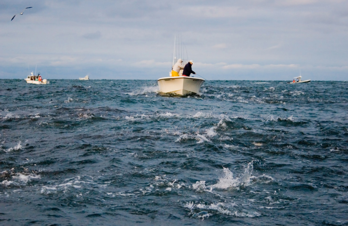 If you run up-current on the outside of these rips to the top of them so you can drift through, you will accomplish three things. First, you will not run over the feeding fish and put them down, nor will you break up the “bait balls,” which is most important. You will not throw a disruptive wake at the other boats, thus they will not try to block you out every chance they get in the future, which in Montauk, they most certainly will. Lastly, you will be able to cast into the breaking fish with an organized fly-line from a stable platform, and you’ll be able to keep your line tight from the very beginning of the retrieve as you cast across- and down-current. Casting into the current will most often lead to slack line and few bites.