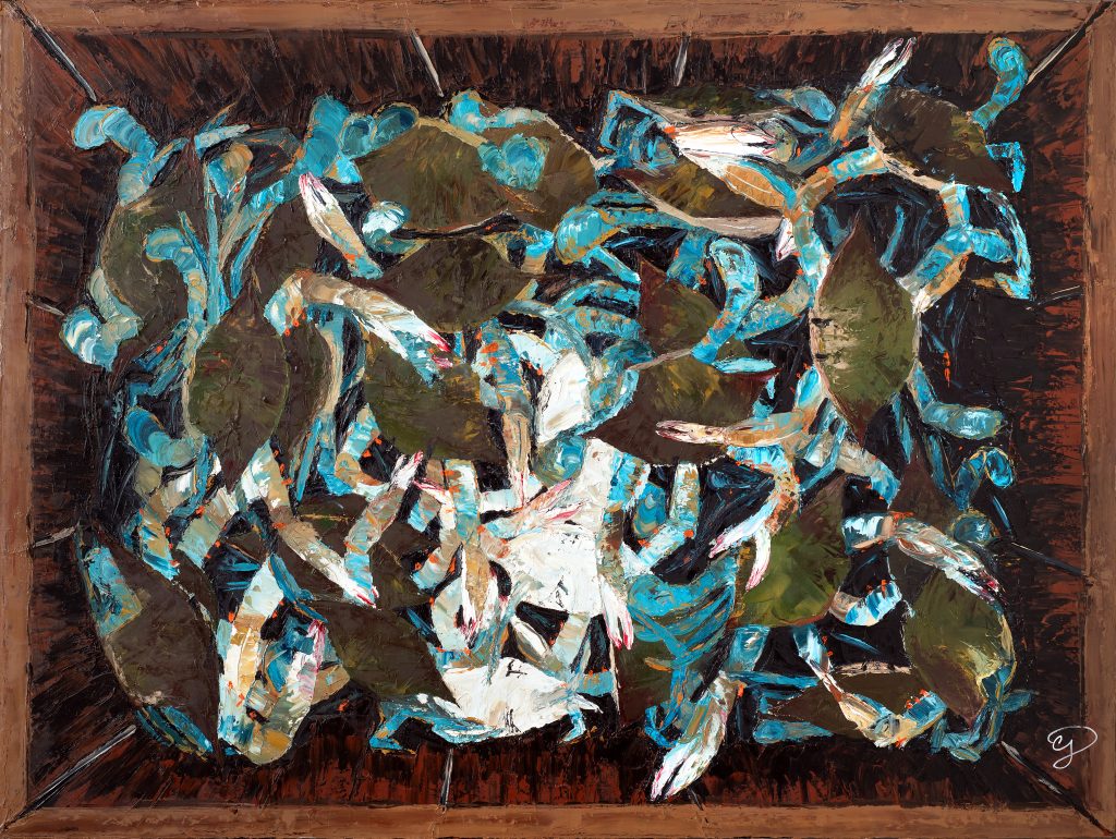 His body of work is a confluence of coastal subject matter that reflects his place, passions, and interests, so he enjoys immersing himself in the creative process because painting—like fishing—is a therapeutic exercise. “My job is very stressful. I come home and even though I’m exhausted, I can’t turn off my brain,” he said. “I’m the type of person who needs to be doing something, so rather than just flip on the TV, I’ll sit down and paint for an hour. It forces me to think about only what’s right in front of me, and I need that outlet in my line of work.” Weathered bobbers, bushels of blue crabs, fishermen, shark teeth, surfers, tunas, and seaside shops and restaurants … they’re all expressions of his personality and nautical lifestyle. “Everything I paint is a product of where I was raised and where I live.”