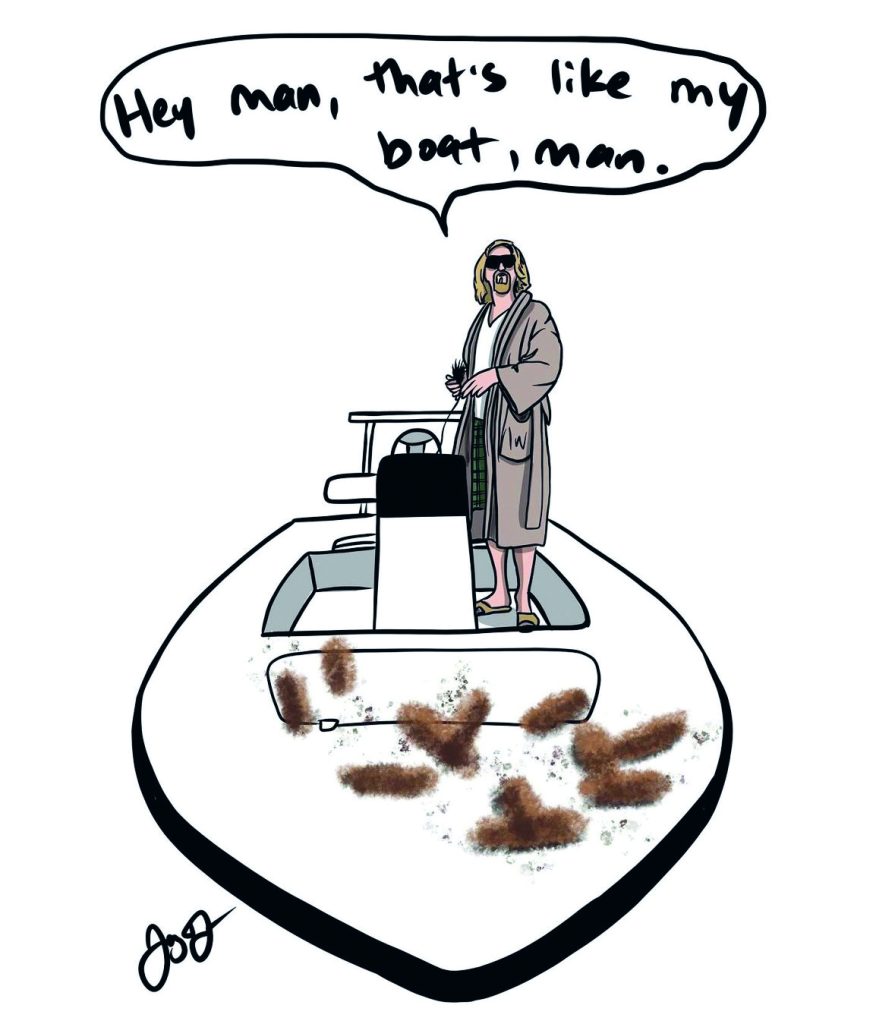 “The Dude abides” is an all-time quote from the 1998 cult classic film, The Big Lebowski, starring Jeff Bridges as The Dude––a goofy, nonchalant hippie who, even in the face of crisis, only cares to sit back, chill, and go bowling. The famous quote loosely translates to “just relax and enjoy life’s simple pleasures”, an ideology most fishermen can get behind. Through his illustrations of fish, flies, and doodles of characters like The Dude poling around salt marshes, Jay Talbot effectively captures the lax “toes in the water, tush in the sand” vibe that is shared by anglers, boaters, and bowlers alike.