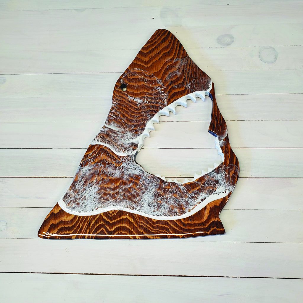 Much like his father, Hallinan knows no limitations when it comes to what he can build. What started as constructing tables and cornhole boards evolved into an outlet where he shares his unique wave designs on welcome signs, bar tops, serving platters, coasters, and wall displays in the shapes of marine animals, ships, and more. “Each piece is truly 1 of 1. I have an entire wall of templates, allowing me to use the same size and profile of a shark or sea turtle for events like craft fairs. However, no two wave designs will ever be exactly the same. Plus, I have a laser engraver on permanent loan from a friend so that I can customize each piece with text or numbers.”