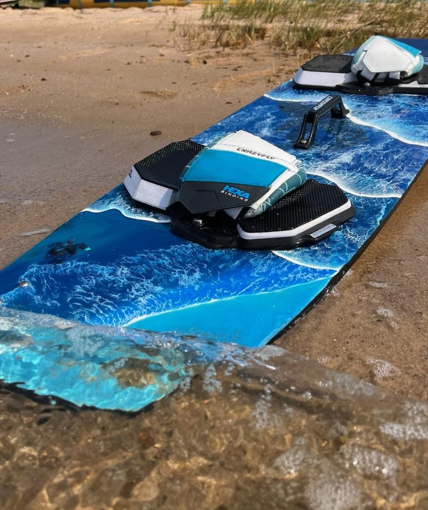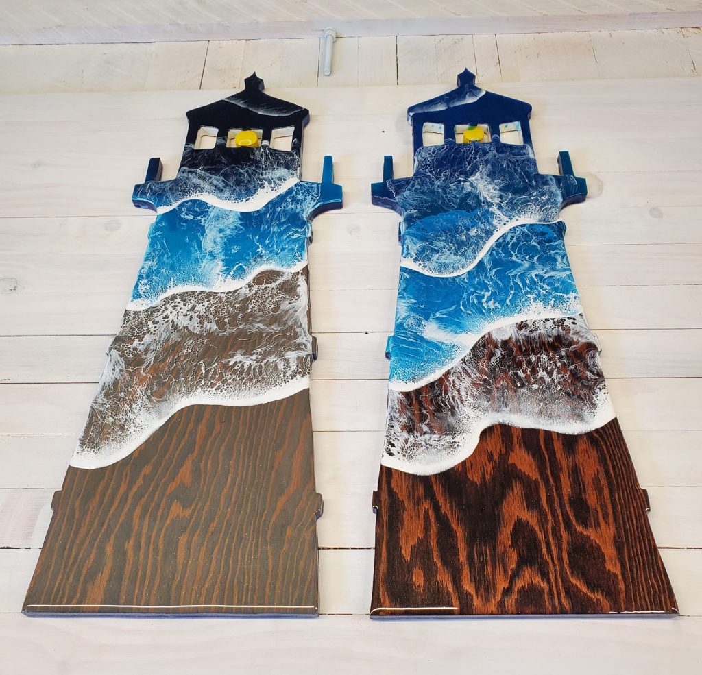 Hallinan’s “river tables” featured the path of a meandering riverbed, painted in turquoise, navy, and royal blues, beneath a shield of resin. His depiction of water using different shades of blue not only creates depth within each piece but also provides a unique contrast against the wood’s natural grain. The style was well-received, and eventually, he expanded his canvas to include cutting boards. “Before the ‘cutting board boom, ’” he chuckled, “I had seen a few people on Instagram mess around with paint and resin to create this look of a wave crashing on the beach. The wood base with ocean waves is inherently nautical, so I made a couple myself and kept practicing. It took me around six months to get my particular wave pattern to a place I was happy with.”