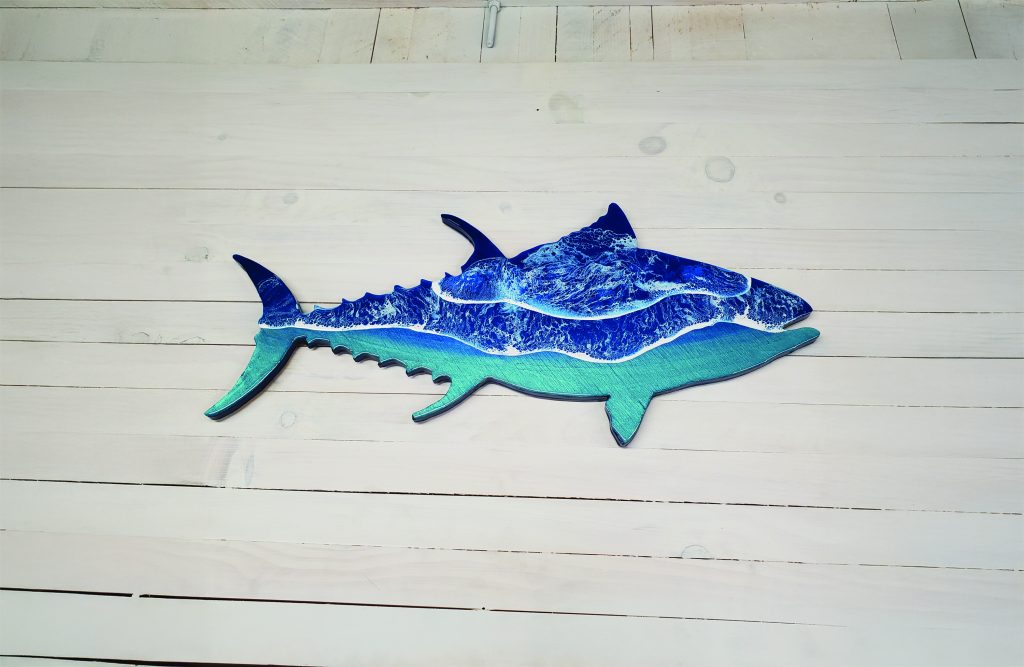 Each piece begins with a template that he traces and cuts out of plywood before applying the base layer of paint. “I try to add a variety of colors that fit the animal, fish, or object I’m building.” A bluefin tuna, for example, may receive a base of deep-sea blue to illustrate the offshore waters in which they dwell, before the first layer of epoxy. Through trial and error, Hallinan found that mixing paint directly with liquid epoxy didn’t achieve his desired effect. “Instead of mixing the two, I tint every layer by adding ink, which helps to blend every color change. Different colors represent different depths.” He adds a wave between each color change to disguise the transition, and the result of this layering technique—paint, dry, epoxy, dry, and repeat—leads to a finished product that perfectly illustrates the natural, ever-changing flow of ocean swells.