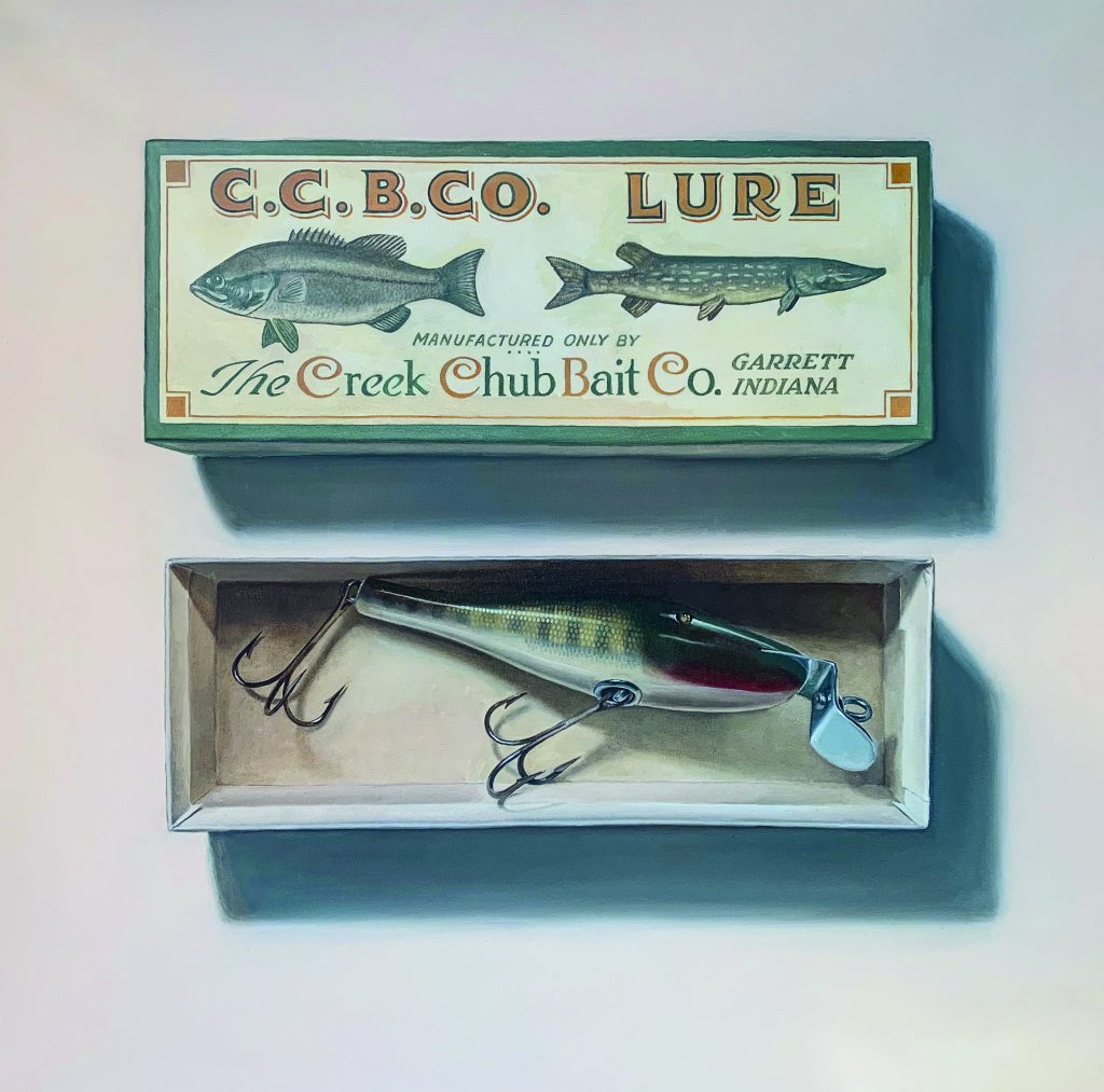 Upon close observation, the oil paintings done by Ralph Frisina display minute details and intricacies of their industrial and vintage subject matter, whether it’s the dull sheen of a rusting treble hook on an original Creek Chub Pikie, or the exact size and make of the nuts and bolts used in an old Evinrude Zephyr outboard motor. These are the vessels through which anglers and watermen of yesteryear engaged with the natural world, and while nature is not the immediate subject of Frisina’s work, it is the main influence behind each stroke of his brush on the canvas.