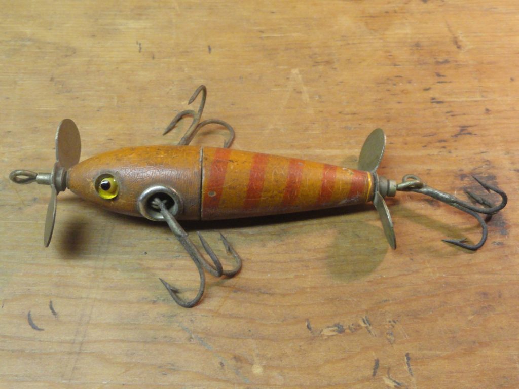 Our last lure might be my favorite. It looks like something that Dr. Seuss would have created and has absolutely no resemblance to anything I’ve ever seen in the natural world. It was created in 1914 by William H. Miller from New York. Miller had a small boat and often fished Cayuga Lake for bass, and it is there that he probably tested his first prototype. The lure features spinners that rotate in opposite directions and surely made quite the commotion in the water. Recent auctions of this classic lure netted over $6,200.