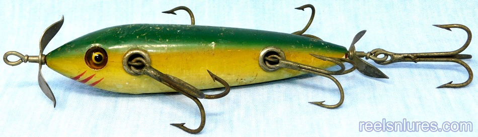 The Charmer Minnow Company from Springfield, Missouri, first patented this triple-treble design in 1910. Their lures featured glass eyes and spinners made from German silver. The larger 5-inch models are quite rare, and those painted with the “barber pole” spiral pattern are the most desirable. This lure has probably charmed more lure collectors than it did fish; in 2018, one was auctioned for just over $25,000.