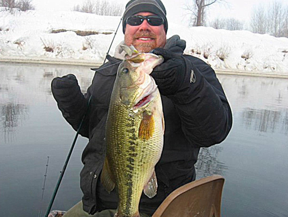 My favorite picture of a swimbait fish from Massachusetts is of Joe from Real Prey Swimbaits with an 8-plus-pounder that hit one of his prototypes. He is dressed like he is climbing Mount Everest, and there is a snow-covered hill in the background. It was certainly a day many would find an excuse not to fish at all, and most would definitely find an excuse to not throw a swimbait. Turns out Joe also caught an enormous 5-pound, 9-ounce smallmouth the same day, I believe solely because he was throwing big swimbaits.
