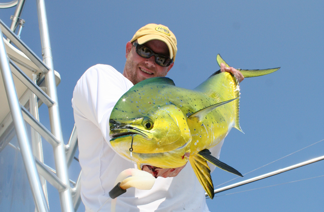 It is always great to hook a big mahi, but you will be missing part of the allure of these fish (their delectable flesh) if you don’t get them into the boat. Here are a few things to remember to help ensure that this happens. When a big mahi is hooked, it will take to the air several times during the fight. The mahi will run at blazing speed under the water and then come up like a missile out of the water into the air. To make sure that the hook doesn’t pull, the angler needs to follow the flight of the fish with the rod tip. Most importantly, you will need to lower the rod tip when the mahi is re-entering the water.