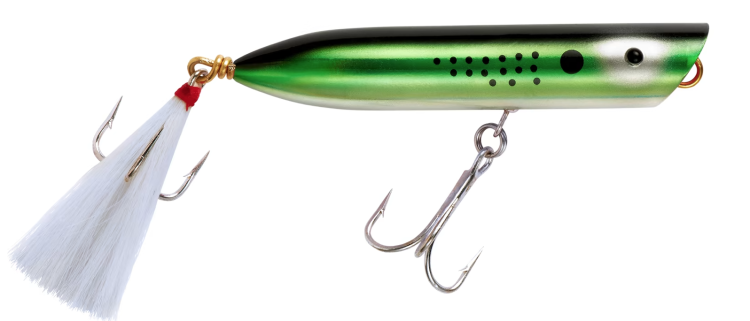 Rhythmically retrieving the Polaris Popper is crucial to generate a significant splash with its cupped face. Twitch the rod tip just enough to throw water, reel down the slack, and with a taut line, repeat the process. Fast retrieves work as well as a slow “splash-and-pause” as long as it’s not so fast that the plug is surfing and being ineffectively dragged across the surface.