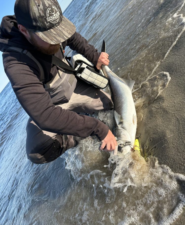 Open water, bigger surf and larger prey… everything is bigger out front. There’s no sight fishing in skinny water here. From ripping currents of the inlets and jetty points, to the troughs, sandbars, eddies and everywhere in between, big blues patrol like the bouncers of the beach. They control which baitfish, if any, will successfully make it in or out of the inlets. Sometimes they’re too low to spot, but when bluefish are suspended or pinning bait to the surface, a large topwater plug is necessary to grab their attention in the tumbling waves and sweeping currents.