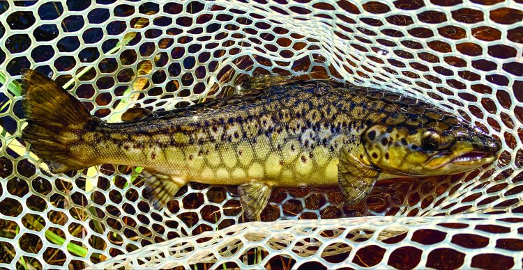 I stepped carefully into the icy current and waded slowly toward the middle of the river. There was a heavy fog over the water, so I couldn’t see to the other side. As I started to pull line off my reel to make a cast, it felt like I was fishing inside a cloud. The visibility would have been more troublesome if I hadn’t stood in exactly this spot the evening before. I already knew about the deep, slow pool just across the river, where the water pushed and gurgled its way around and through the giant root ball of a fallen tree. On one of my last casts of the evening, a heavy thump and flash in the water as a fish hit my streamer told me the pool held nice fish.