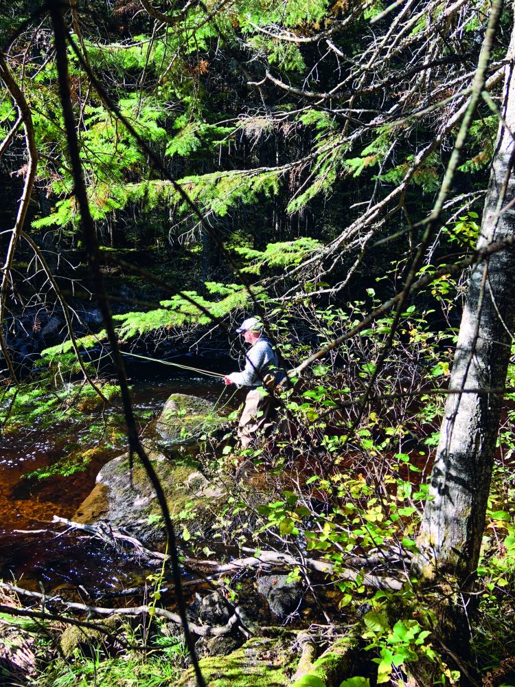 We saw very few fishermen, but the logging roads were busy with traffic from both bird hunters and leaf-peepers. Trucks with folks wearing blaze orange and hauling dog kennels in the back passed back and forth like a hunting parade. Later, as I fished my way back to our vehicle, I was swinging a fly into the pool under the bridge where we’d parked. A large SUV stopped on the bridge, and a woman climbed out with a camera and a lens the size of a fire extinguisher. I tried not to hook any branches on my back-cast as she snapped photos of the river and brightly colored foliage that I’m pretty sure included me. I was glad I had bought new waders for the trip and wasn’t wearing the old ones with patches of Gorilla tape along the thigh.