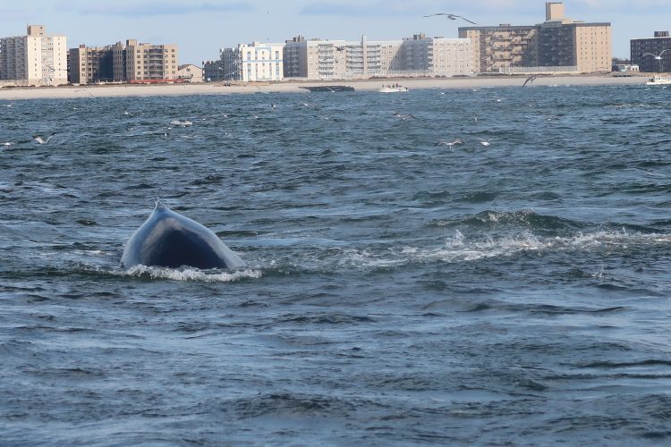 The fishing took off from there, and we had stripers on nearly every drop with the exception of the occasional spiny dogfish. Schools of bunker appeared to be growing more dense, or at least more tightly packed. Humpback whales cruised lazily around us, inhaling mouthfuls of menhaden within a surf-rods reach of the boat at times, which sent the escapees spraying into the Lady Ashley‘s hull.