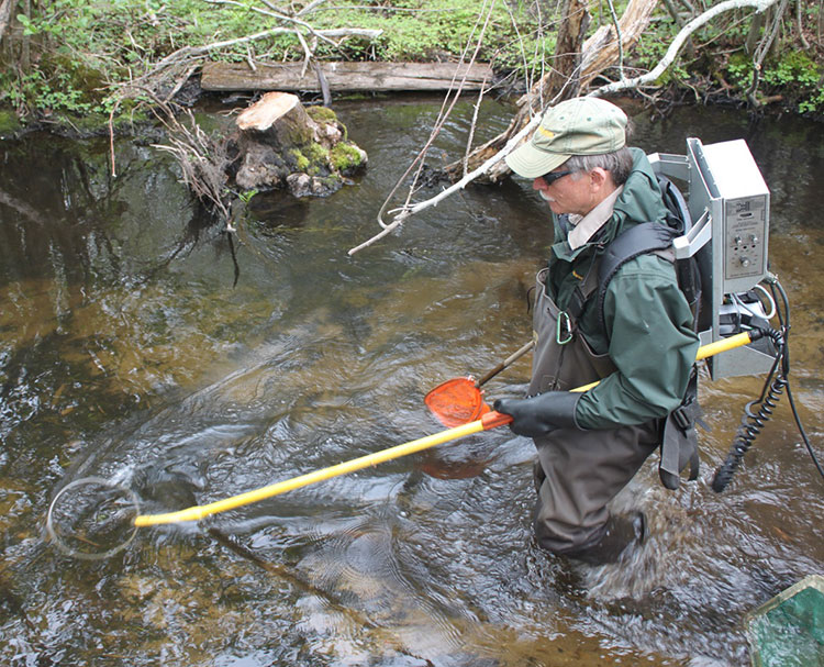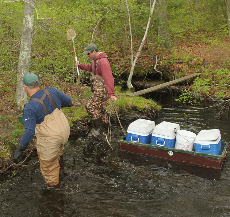 I recently had the opportunity to tag along with Steve Hurley on an electroshocking survey on the Coonamessett River, and I was delighted to find that its native brookies are thriving. Steve is the Southeast District Fisheries Manager for MDFW, and he has gained a wealth of knowledge on these majestic fish.