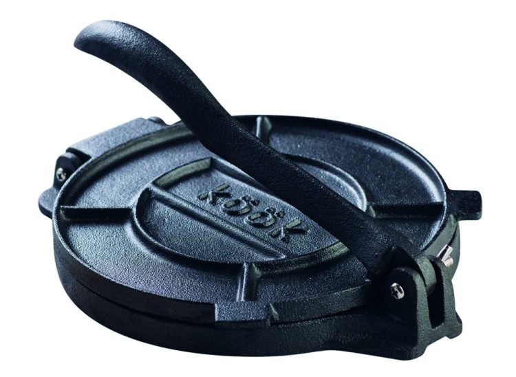 Cut a gallon zip-close bag around the perimeter to make two sheets. Place one sheet on the bottom of a tortilla press, add the dough ball in the center, and place the second plastic sheet on top. (The plastic keeps the dough from sticking to the press.) Press the lever until the dough is flattened into a tortilla. It might take a few tries to figure out the right amount of pressure needed, but if you mess one up, just roll the dough back into another ball. If you don’t have a tortilla press, you can use a rolling pin, but the press makes things go a lot quicker.