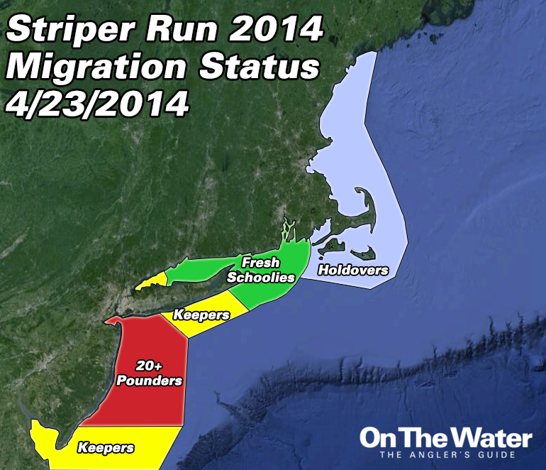 In New England, Connecticut and Rhode Island both have schools of migrating schoolie bass along the coast, and there have been keeper-sized fish reported from several Connecticut Rivers. There has been no word of “fresh” stripers reaching Cape Cod or Buzzards Bay as of Wednesday, but holdover stripers have been active up through Boston Harbor. It won’t be long until migrating stripers join them.