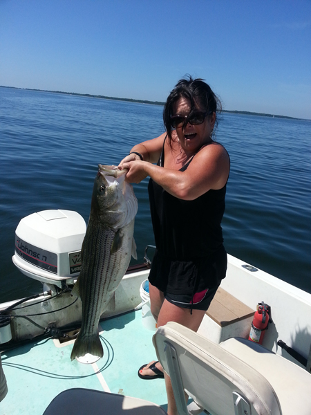 On Saturday, I fished Ohio Ledge in upper Narragansett Bay in 12 feet of water right after the turn of the high tide. Bite lasted for 1 hour and then they were gone. We chunked pogies on sliding sinker rigs anchored up in the middle of the ledge. We caught 5 fish – 28,29,32,34 and the nice 36 inch 20 pounder shown in the pics caught by my wife Michelle Kelley pictured with her cousin Donny Perry. We lost one heck of a nice fish as well. It was peeling line when a knot, tied by me, came undone. Sour! A great day on the water.