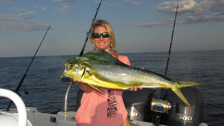 In the morning we were back on the troll but the tuna couldn’t be found. Around 9am we made the call to pull lines in and fish a few more pots for mahi. The mahi were thick and fired up which made for great fun watching them take baits just under the glassy water. Even had a close encounter with an ocean sunfish who chased the boat around for a while. Had a couple sessions of triple hookups, mahi flopping around everywhere, good times.
