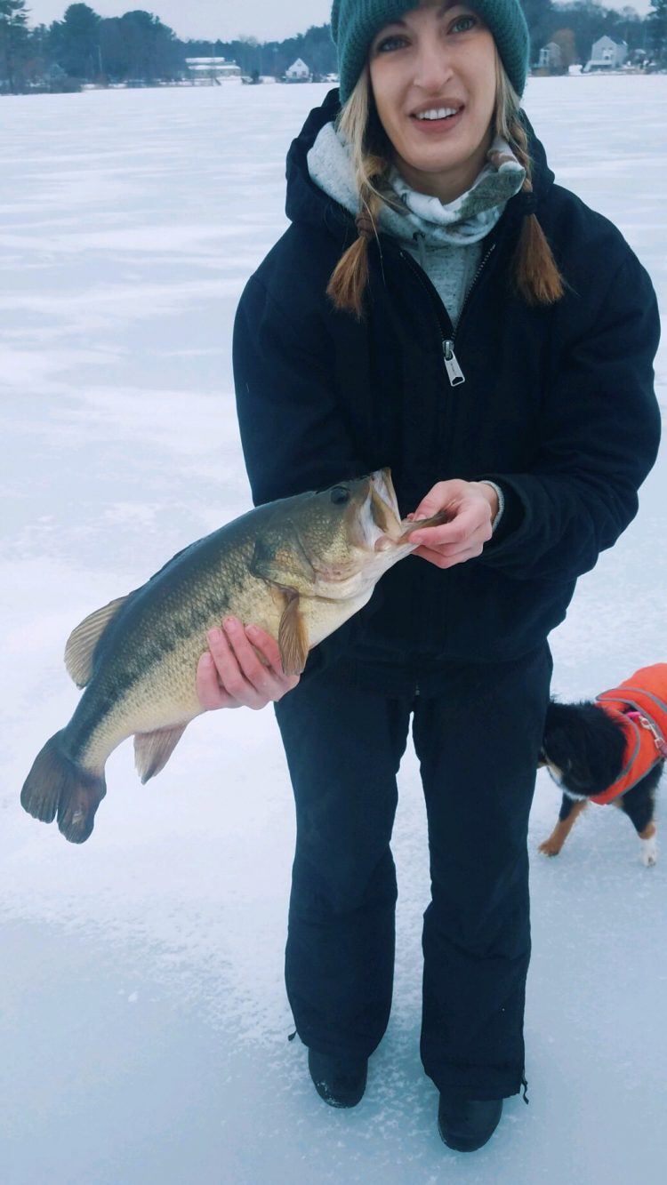 On the ice this week, the chew continued. Angler Hunter Thayer has been out fishing almost daily, and reported: “We’ve been finding good ice in the Plymouth area with about 6 to 9 inches. We will be heading back out tomorrow (2/10) hopefully to get back on the bite.” Hunter and his girlfriend, Joyce, have been catching tons of healthy, full-bellied yellow perch, and there have been some other notable catches in the mix. Joyce Simon landed a healthy bass for a change of pace during their yellow perch outing, a welcome surprise.