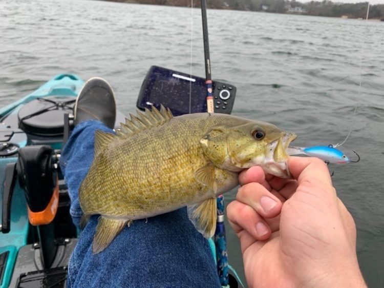 Largemouth bass are good fun, but for many kayak anglers, springtime means smallmouth. Local kayak angler Jack Houghton got into a nice small bite this past week, even though his fish finder battery was dead. Finding fish will come by targeting slopes and drop-offs, ledges, and underwater humps. All it takes to pinpoint the right structure is coordinating fishable spots using a cell phone GPS and a contour map of the lake.