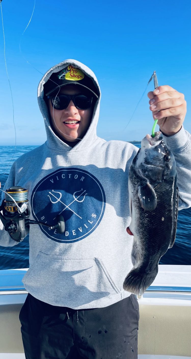 ” Our ‘Sea World’ closed a couple weeks back due to north winds, and since then we’ve been running around on the South side finding albies and bluefish. Black sea bass are biting well in Vineyard Sound, and surprisingly, we recently caught a half a dozen big tautog on our homemade diamond jigs! The craziest part, they’re not around structure either! These 20- to 23-inch tog are coming from sandy areas where we’re also catching scup, sea bass, stripers, bluefish, and more on our jigs. We’re out there seven days a week, figuring things out. When retrieving our jigs through the water column, the stripers seem to follow them up and eat it on the slow retrieve, and bluefish will eat when the jigs are cranked fast and frantic.”