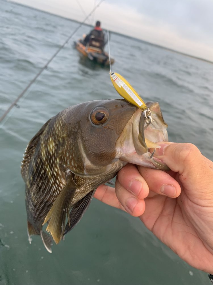 I can’t say with confidence that the mackerel were feeding deeper than the albies, because we saw them jumping occasionally. But, in my experience, Spanish mackerel tend to swim beneath schools to terrorize from below, slashing through unsuspecting pods of bait with acrobatic leaps. They go fully airborne, following an arch-like path in mid-air that makes them easily distinguishable from albies that roll, tumble and crash on the surface. I even managed to place an accurate cast into a frothing feed of albies, which rewarded me with my first of the year and my first-ever kayak albie.