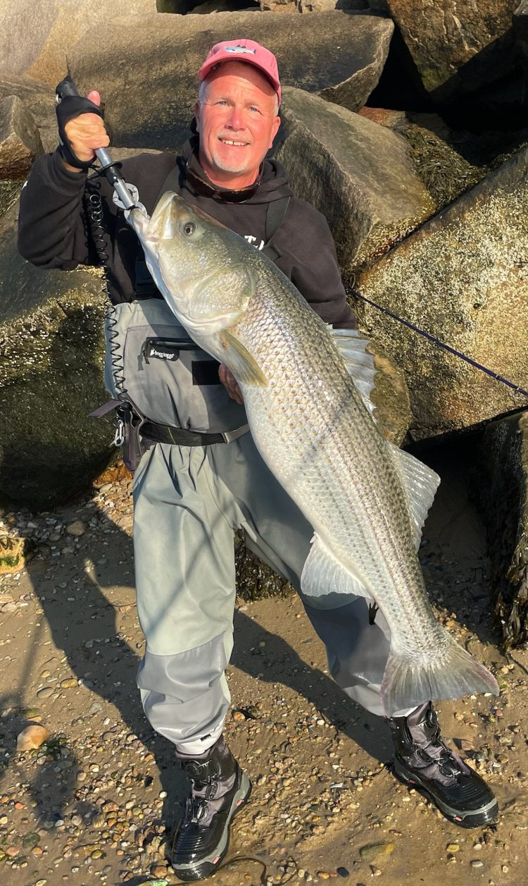 “Fall fishing continues to be fantastic in the Canal. Josh Douglas of Woonsocket, RI caught a half dozen high end slots on a white FishLab during an early morning east tide at Pip’s Rip. Kenny Nevins from Sagamore Beach had a nice 2 day run bringing 26 fish to the rocks at pole 80 and Pip’s Rip. Legendary surfcaster Charlie Murphy of Mass Bass fame watched a guy with a fish on at Pip’s Rip that was fighting so hard it was pulling the angler forward so the Houghs Neck resident immediately thought that the fisherman should loosen his drag. The fish was foul hooked, but it would have been a terrific battle anyway as Charlie saw the fish on the Boga and heard somebody yell “43”! Tim “Hollywood” Petracca of Bourne, Paul “The Painter” Gravina of Sandwich, “Mashpee Mike” LaRaia and Pocasset’s Bill “On the Grill” Prodouz all registered double digit catches on an early east tide. The fish were all different sizes with “Mashpee Mike” taking top honors with a 40 inch linesider. White was the magic color with the Guppy 3 ounce Jobo, Jr. performing well during the 2 hour topwater bite. A few days later “Hollywood” had his green mack Northbar working on a half dozen fish including 2 slots on the west rising tide.”