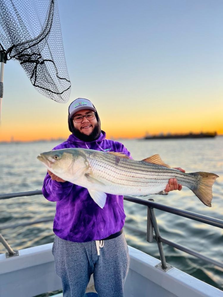 “Today was the first day that we were out in a week. Peanut bunker are leaving the bay and flooding the ocean. We were pleasantly surprised with a new body of bass that moved into the area. This morning’s charter caught and released 40 keepers using live bunker and flutter spoons. The beginning of the fall run seems to have started.” Go to rockfish charters.com for more information.