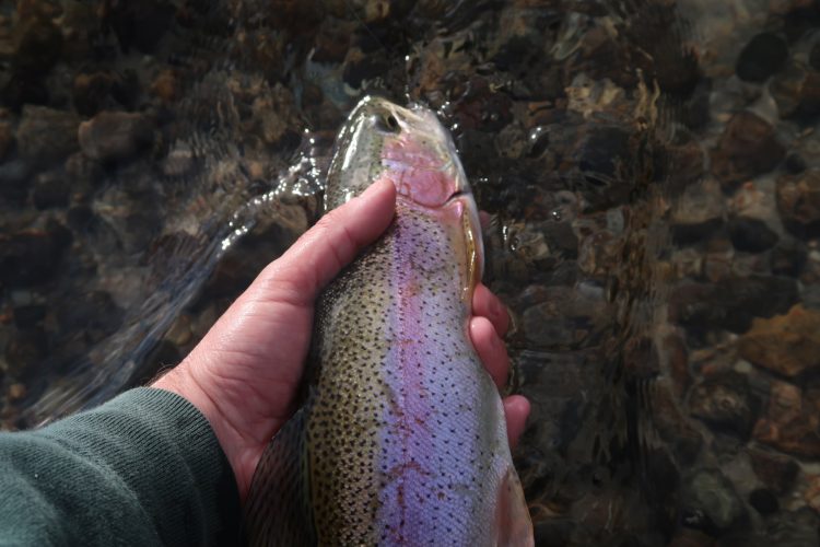 One fish hit on a low and super slow retrieve, the second hit on a twitch and retrieve, and the third fish struck the Kastmaster on a steady retrieve through the middle of a shiner school; the fourth take was my favorite, despite it being the smallest fish of the day. The bite had slowed but in my past experiences at this spot, a frantic retrieve of the spoon across skimming across the surface would draw violent strikes from rainbows as they chased down what they figured was a fleeing shiner. I flipped the bail before the spoon splashed down, and keeping my rod at a 90-degree angle, began a fast retrieve with an occasional twitch of the rod tip to skip the lure on top. Almost immediately, a tell-tale swirl behind my spoon indicated a trout had taken interest, and after one more twitch, I watched the trout slurp my blue-chrome Kastmaster from the surface.