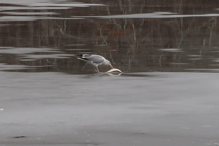 It is my thinking that the bunker are residents; it is highly unlikely these fish came into this pond on an incoming tide in mid-March. In this same pond, I’ve seen white perch blitzing on peanut bunker that got trapped after swimming through the culvert in the late fall. Pretty cool stuff, just like a mini-striper blitz. I’m hypothesizing, but I think that those peanut bunker stick around and grow into adult bunker in that pond. Last February, I saw a gull eating a full-sized pogy on the ice.