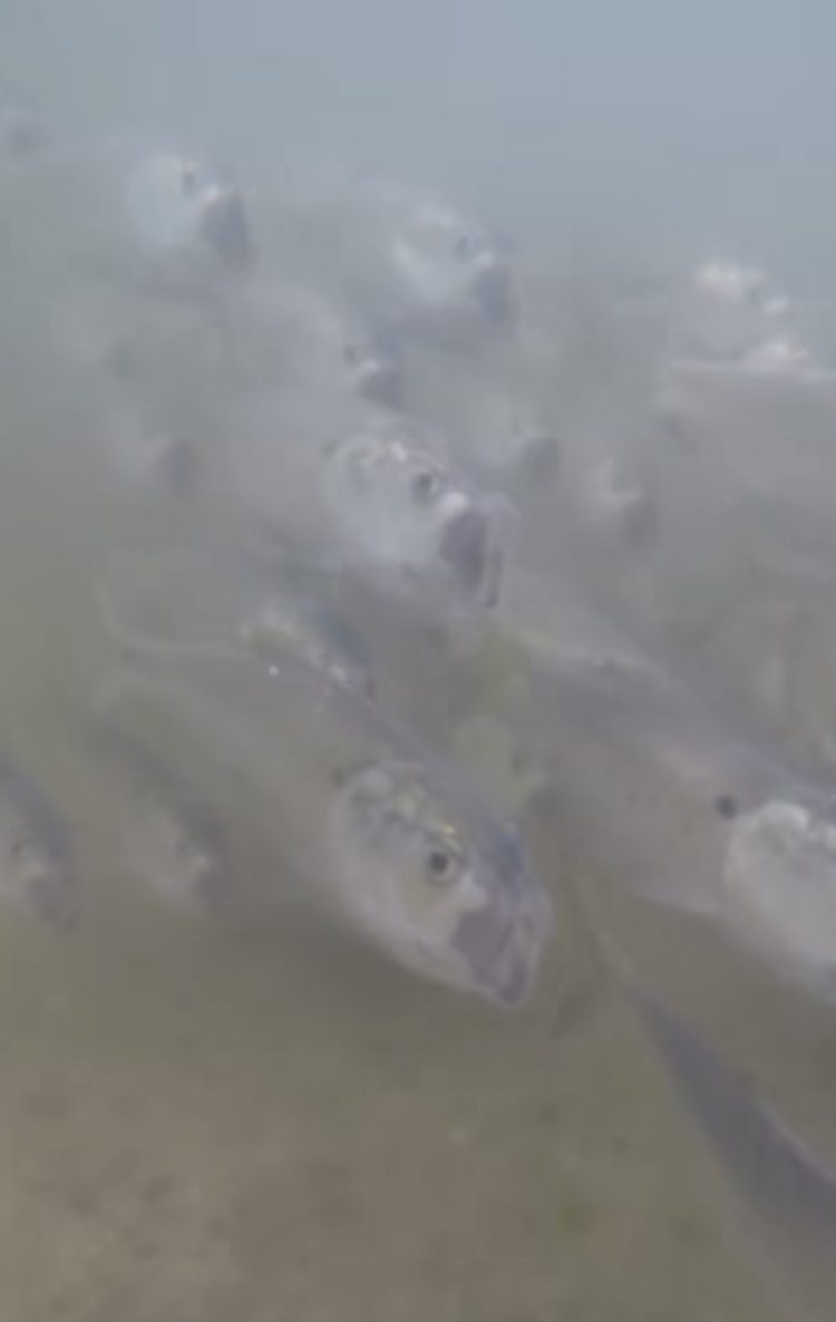 In March, white perch activity also increases in the rivers and brackish ponds. I went out for some white perch last week, and with the incoming tide on my side, I was almost certain they’d be stacked up within casting range. To my surprise, nothing I threw at them was getting touched. Finally, a few small taps came here and there, but the strikes were not familiar. The water was cloudy and murky, so to get a better idea of what was happening beneath the surface, I whipped out the GoPro extendo-stick and investigated the muddy bottom. When I pulled up the camera to see what I had recorded, a massive school of bunker popped up on my screen, filter feeding as they glided back and forth with the current.