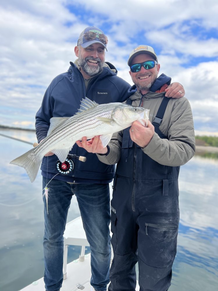 “I took a couple of the Rise Fishing boys on my skiff yesterday for a cloud-covered session in Stony Brook. I poled Tim and Steve around some flats, some deeper water, and some fast currents for a few hours around noon. The water was ultra clear (minus the pollen slicks downwind), and the outgoing tide produced some hungry schoolies that were feeding on medium-sized white presentations (think herring). In deeper water, we fished deep, although a topwater spook provoked a strike from maybe our biggest fish of the day. When the guys had their fill, I hopped on the bow to throw a few loops. A couple more schoolie bass came to my hand before we made our way back.”