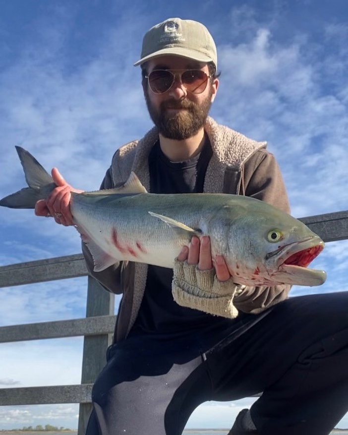 “Russell got out on the local pier and caught a nice gorilla bluefish the other day. He was soaking a bunker chunk in the morning. Kyle weighed in a 5.4 pound fluke he caught aboard one of the local party boats yesterday morning.”
