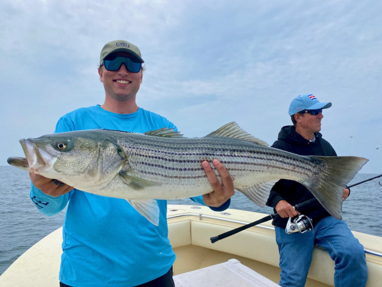 “We’ve been out in the rips catching bass and blues this week but we’ve also been fishing in tight to shore around boulders and finding quality bass. We were also bouncing Buzzards Bay and Cape Cod Bay this week finding some good striper fishing using mostly topwater plugs when the tide was on our side. Our trips have been focused on getting keeper fish for the clients with some action from big blues, plenty of schoolies and a bunch of oversize stripers too. We fished in some shoddy conditions earlier this week with big swells and we could see bass cruising in the waves, and shortly after noticing them, the bass turned on and started hitting our plugs on every cast. We haven’t been doing much black sea bass fishing because it just hasn’t been as good as years past, but we are getting dinner-plate sized scup that are perfect for the table.”