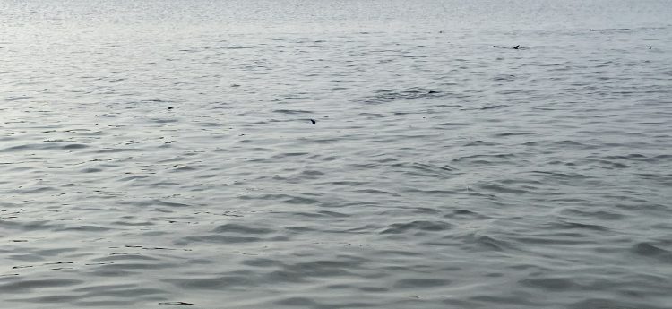 I paddled around looking for more bluefish, when I noticed some nervous-looking water directly ahead of me. As I got closer I spooked a dozen bluefish only inches in front of my kayak. They were visibly swimming on the surface, close together in a tight school. When I looked a bit further beyond this group, I noticed the full extent of this. Hundreds of black fins and tails were sticking out of the glistening water, back-lit by the low afternoon sun.
