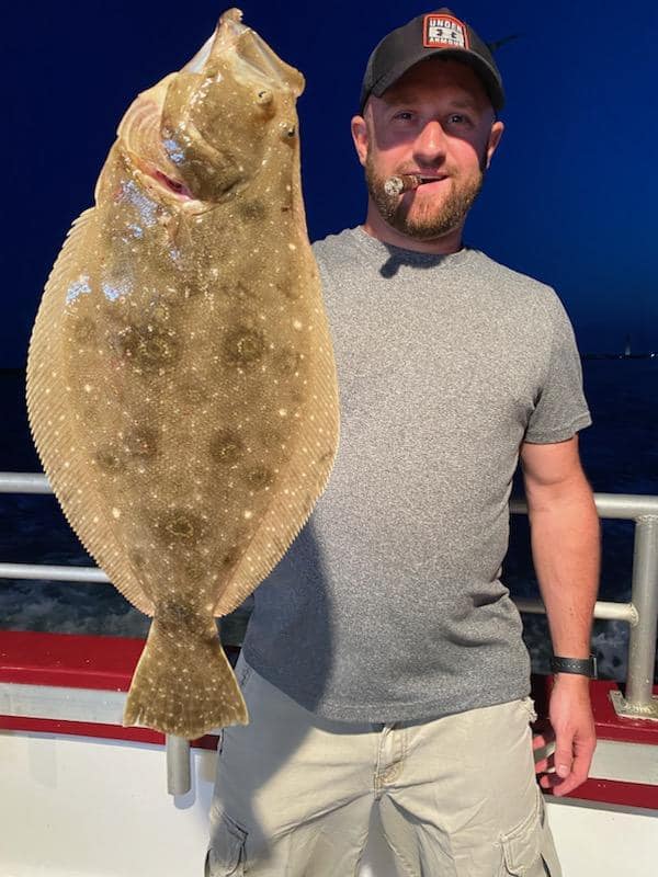 “Fluke trips lately have seen plenty of action throughout the entire trip. We sailed outside the reef today and saw keepers and shorts, plus sea bass, scup, and a nice codfish for Carl. John picked a pool winner the day before that weighed six pounds. Pool winners earlier in the week were 4 to 7 pounds, with good numbers coming over the rail. On Saturday, we ran a night trip for bass and bluefish. We caught slot-size and short stripers, and a good amount of blues to 7 pounds. We’ll be targeting fluke every night until further notice, from 5 to 9 p.m.”