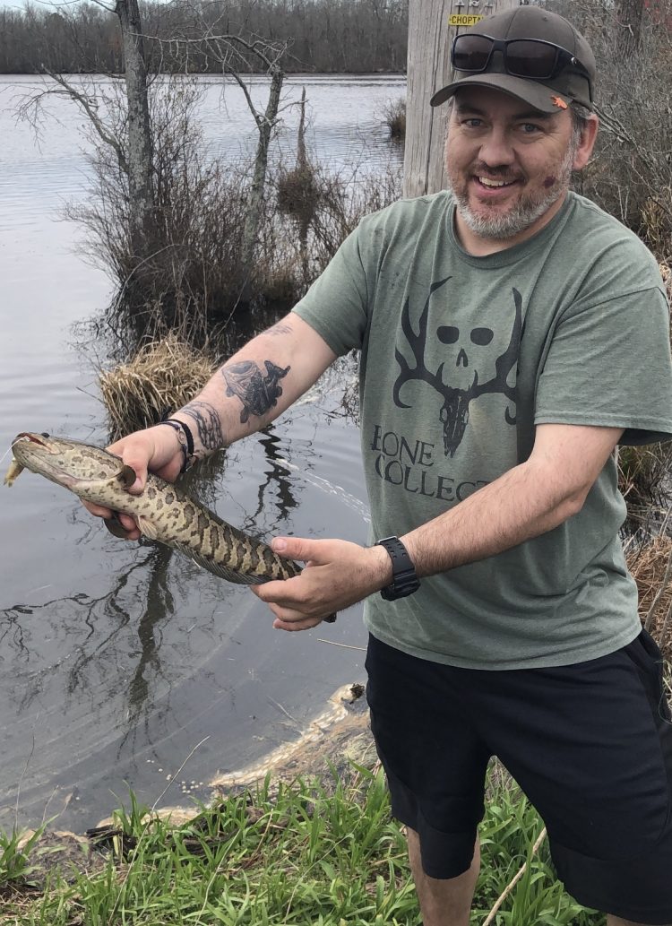 Northern snakeheads can be found in all the rivers off the bay. They have been spawning and protecting their fry balls. So throwing a top water bait like a frog, mouse, or buzz bait can entice them to bite. They get very protective around the fry balls.