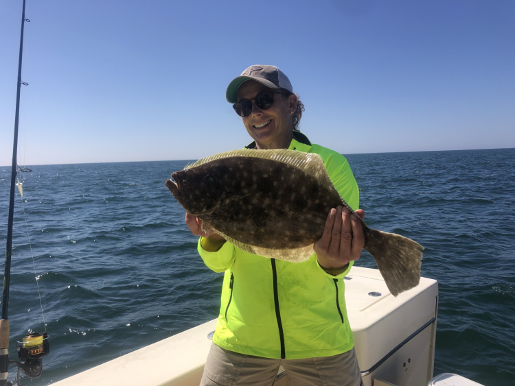 Liz Getz showing off a big fluke she caught aboard Fishsticks Charters.