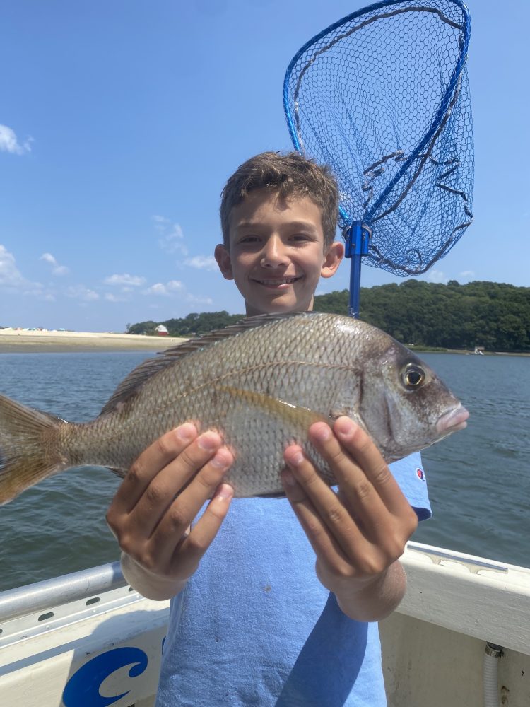 “Fishing was outstanding this week! We broke a fishing camp all-time record on Wednesday, when the kids caught 138 keepers in an hour and 45 minutes. 130 scup and 8 blues came over the rail that morning. Everyone on the boat limited out, and the rods were bending ten at a time. Charters also caught a lot of big porgies and cocktail blues, taking home full bags of filets. The bay has been thick with peanut bunker and spearing. They are everywhere, and birds and blues are all over them. We’re still picking away at some keeper fluke here and there, but that bite has slowed down lately. Luke had a big pork chop porgy, weighing 2.5 pounds and measuring 16 inches.” Call/text Stu at 631-707-3266 or check out Stu’s website to book a trip: northportcharters.com.