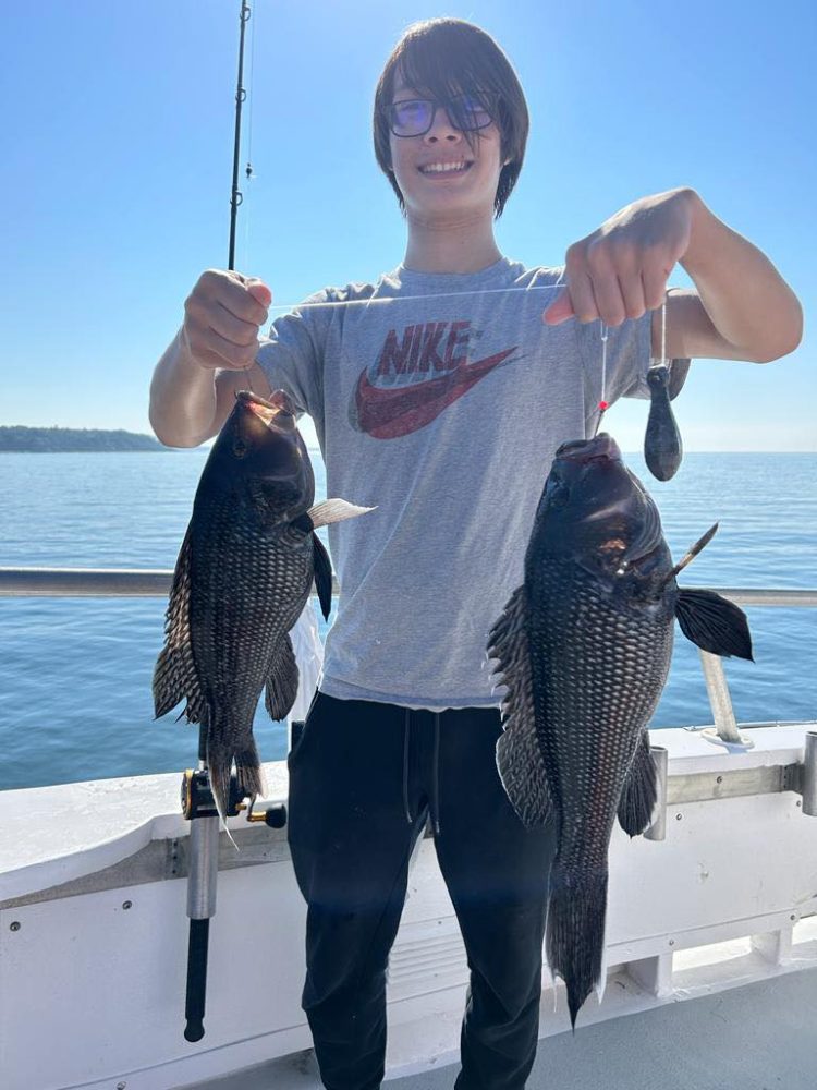 “After being tied down to the dock for a week, we were excited to get fishing again! The bottom fishing was excellent this week. Ward Melville’s fishing club joined us yesterday, and the kids put on a clinic! We found a lot of big scup, plus a striper, in Port Jefferson waters. The day before, we pulled up a lot of scup and had some real nice sea bass action. We ended up filling a full boat limit right at the end of the day. We saw some stripers and a lot of bluefish, big and small, earlier in the week.” Call them at 631-928-3926 for booking info, or check the website/Facebook for more info.