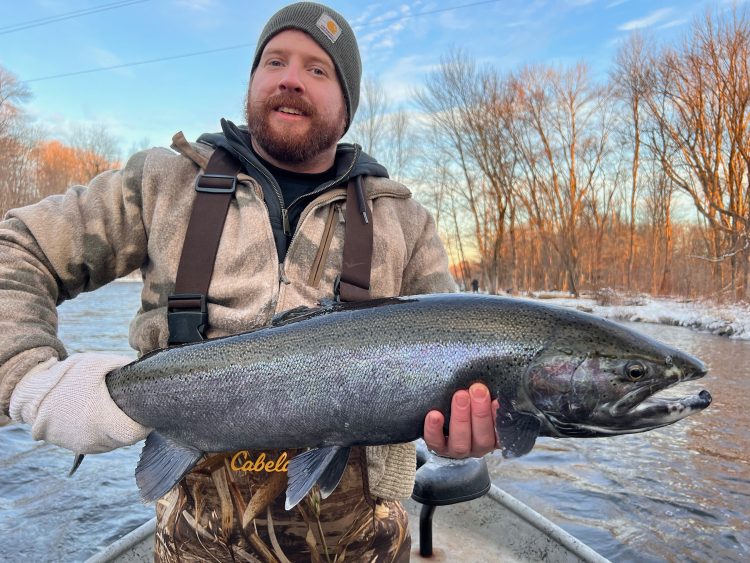 The high water has pushed fish to the slow water. Since the temperatures are hovering a few degrees above freezing the fish have been holding in their traditional winter spots.The high water has also drawn in a few new fish, so don’t be afraid to fish the entire river. Steelhead are spread out throughout the system right now. We have heard of new fish from DSR to 2A (an area that had been quiet before the big water).The best baits have been natural-colored beads in 10-12mm, such as Exit Music, Mottled Glo Roe, Tally Whacker and Honey. Egg sacs in blue, chartreuse, peach and pink have all been producing well. But don’t be afraid to toss a pink worm! Jigs have also been taking a few fish.