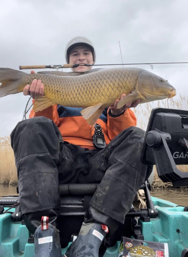 Local kayak angler Jack Francesconi, known on IG as @togdawg, reported from the back-bays: “Perch were stacked up thick on sod banks near the creek mouths in about 3 to 4 feet of water. The water temperatures were around 40 degrees. I was hammering them on super light tackle–6 pound test and a 1/16-ounce jig with a 2-inch grub. Fish it super slow near the bottom with a couple of jigs every few cranks. I even hooked a nice size carp.”