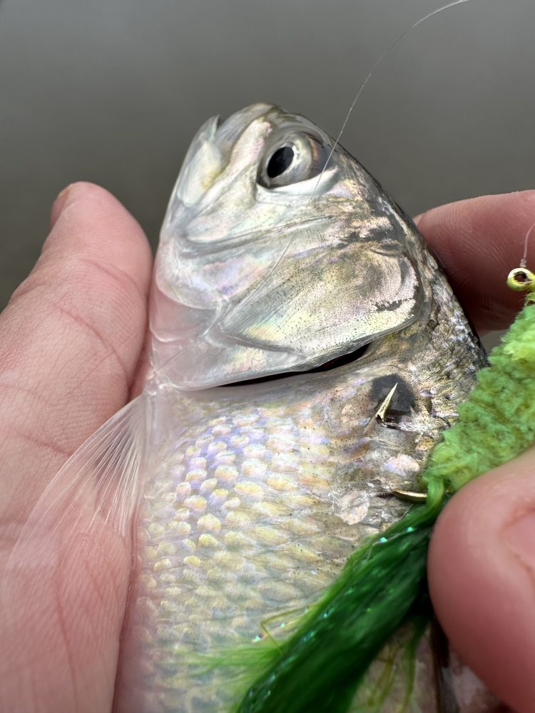 “Walnut” bunker, as Jimmy Fee called them, were swimming into my line as they filter fed on the incoming tide. They’re not quite peanuts, but they’re not fully grown adult menhaden either. It makes you wonder: “are there any holdover stripers in the area?”. Unfortunately, not this time around.