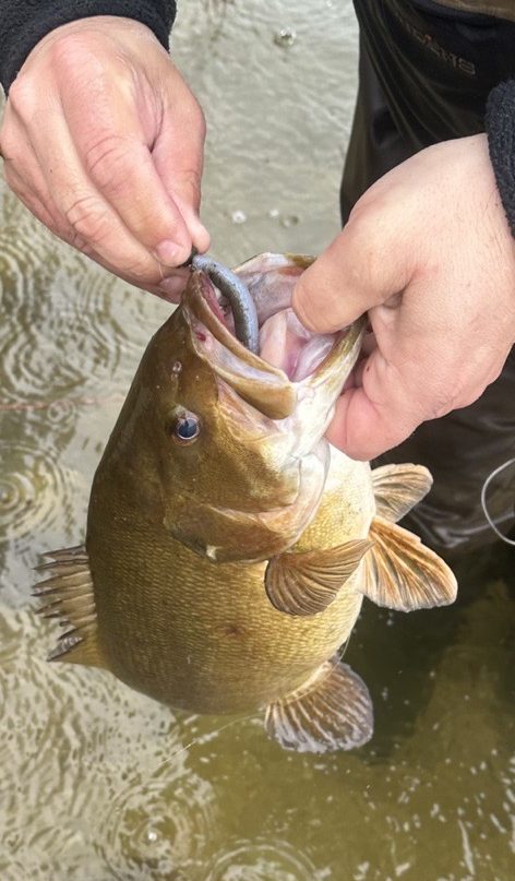Smallmouth bass fishing is getting a little better too. They’re slowly moving shallow, only not quite as shallow as their big-mouthed cousins. I got out in the rain with Anthony DeiCicchi for a short session at one of our local smallie ponds. We threw mostly jerkbaits and small soft plastics like curly-tail grubs and tube jigs, hoping a trout might even swipe at one of our lures if our target species played hard-to-get. Luckily, toward the end of the hour, Anthony hooked a nice bass on a ned rig to beat the skunk, which made getting drenched a little more worth the effort.