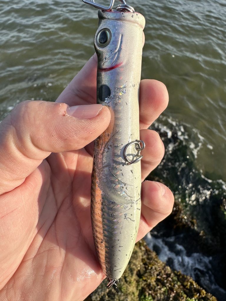 Whether it was a schoolie, a slot or over-slot fish on my line, they were all plump and eating well. The larger bass I caught were tough to figure out. One day they’d be fully lunging, dorsals exposed, in pursuit of my pencil popper, and other days, they preferred the slow, loud popping action of a Super Strike. I noted that pencils worked best from evening to dusk, while bottleneck-style poppers produced best during the morning hours. Additionally, once the southwest wind kicked up to 10 mph plus, pencils with a loud rattle like the Tsunami Talkin’ Popper XD, outproduced standard wooden pencils, like my personal favorite, the yellow 2-ounce Wally’s Pencil Popper. However, each one had its time and place, and the over-slot bass responded well to each presentation as long as I adjusted my lure choice to the conditions.