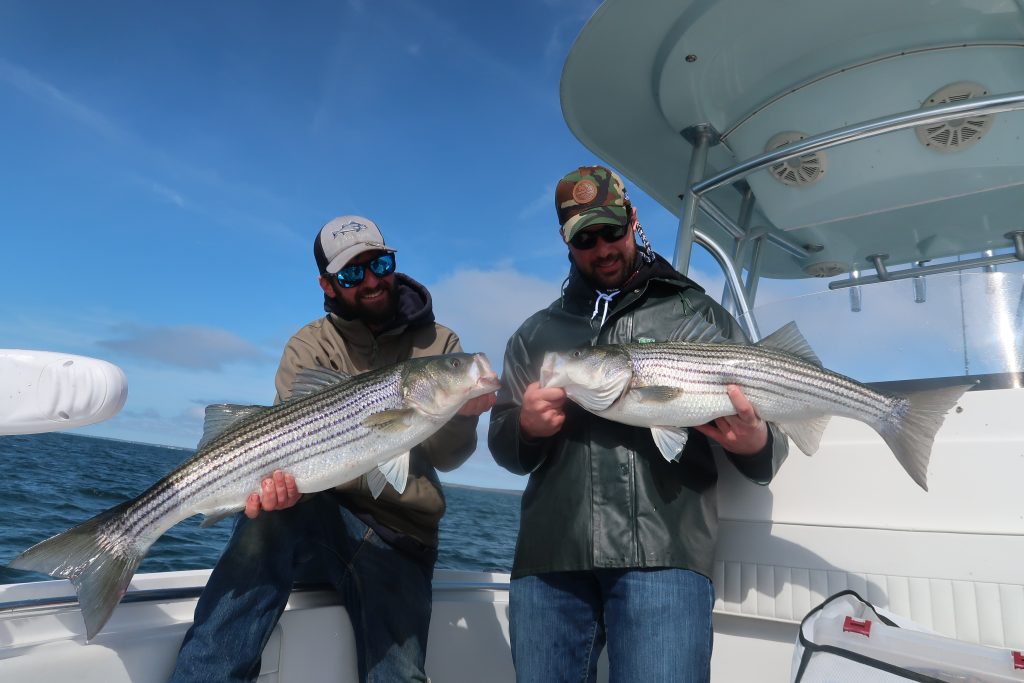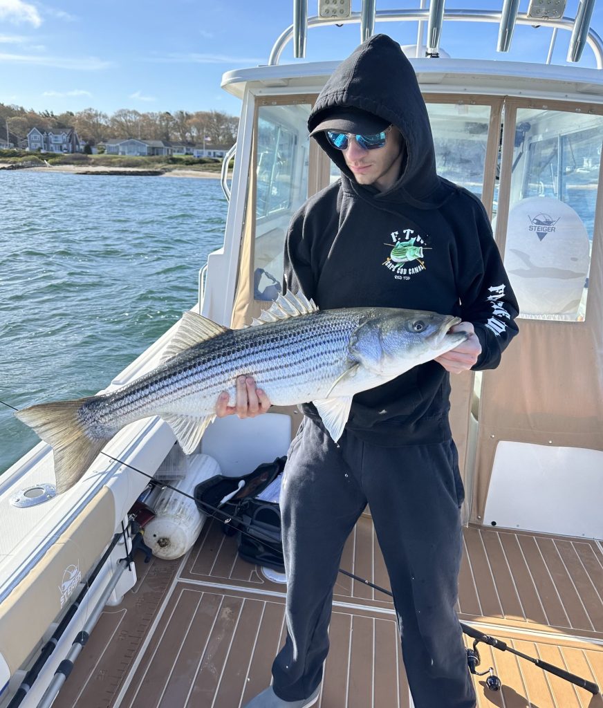 “The past week of fishing in Buzzards Bay has been spectacular. The striper bite has been relentless and the tautog in the bay are sizing up well. There’s not too many boats around yet, so it’s not uncommon to find yourself pushing around a school of stripers alone or with maybe one or two other boats. Our biggest issue right now is deciding whether to leave an explosive striper bite, after catching a bunch, to run down some jumbo tautog. The fish seem to be growing, as we are finding over-slot stripers and twenty-inch-plus tautog. If the past week is an indication of how this season is going to go, we are here for all of it.”