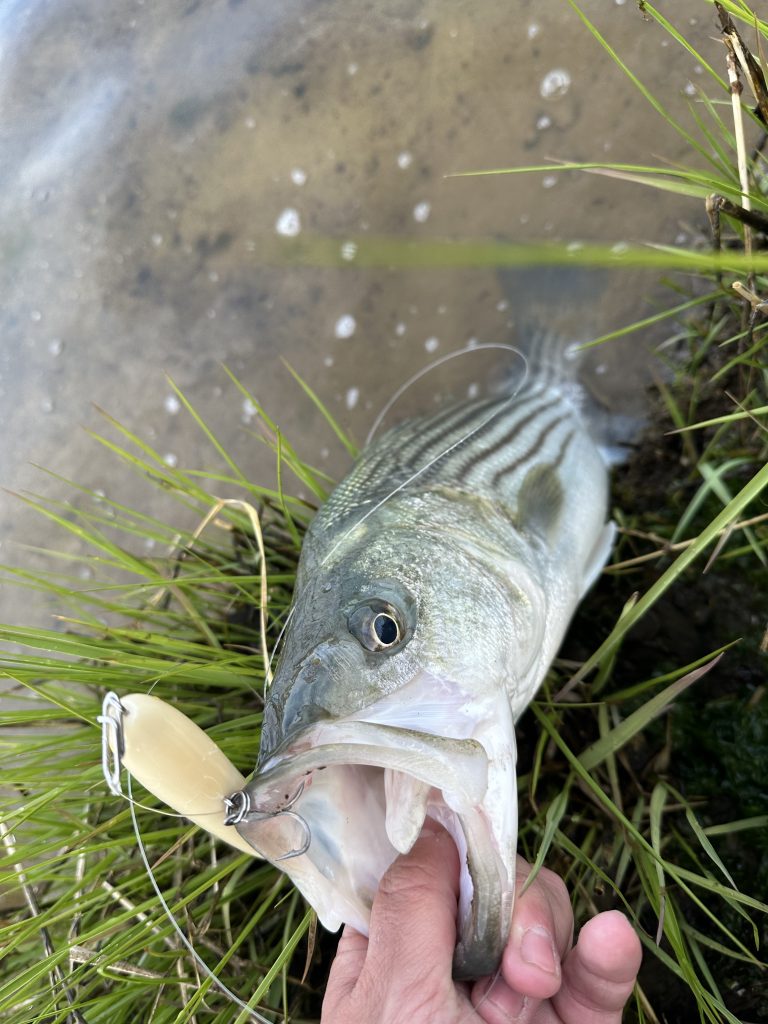 When I tried to repeat the bite on Wednesday, I found the same amount of worms with the same amount of bass feeding on them during the same tide, but they were super picky. I managed one swipe from a fish I’m pretty sure was just annoyed with my lure after it landed on its head in a foot of water. They wouldn’t touch plugs, soft plastics, or cinder worm flies that I casted delicately with my 9-weight from the grass. Eventually, I just stopped and enjoyed the sight of bass finning and swirling over the mud flats, doing their best impressions of puppy red drum. It was quite a spectacle.